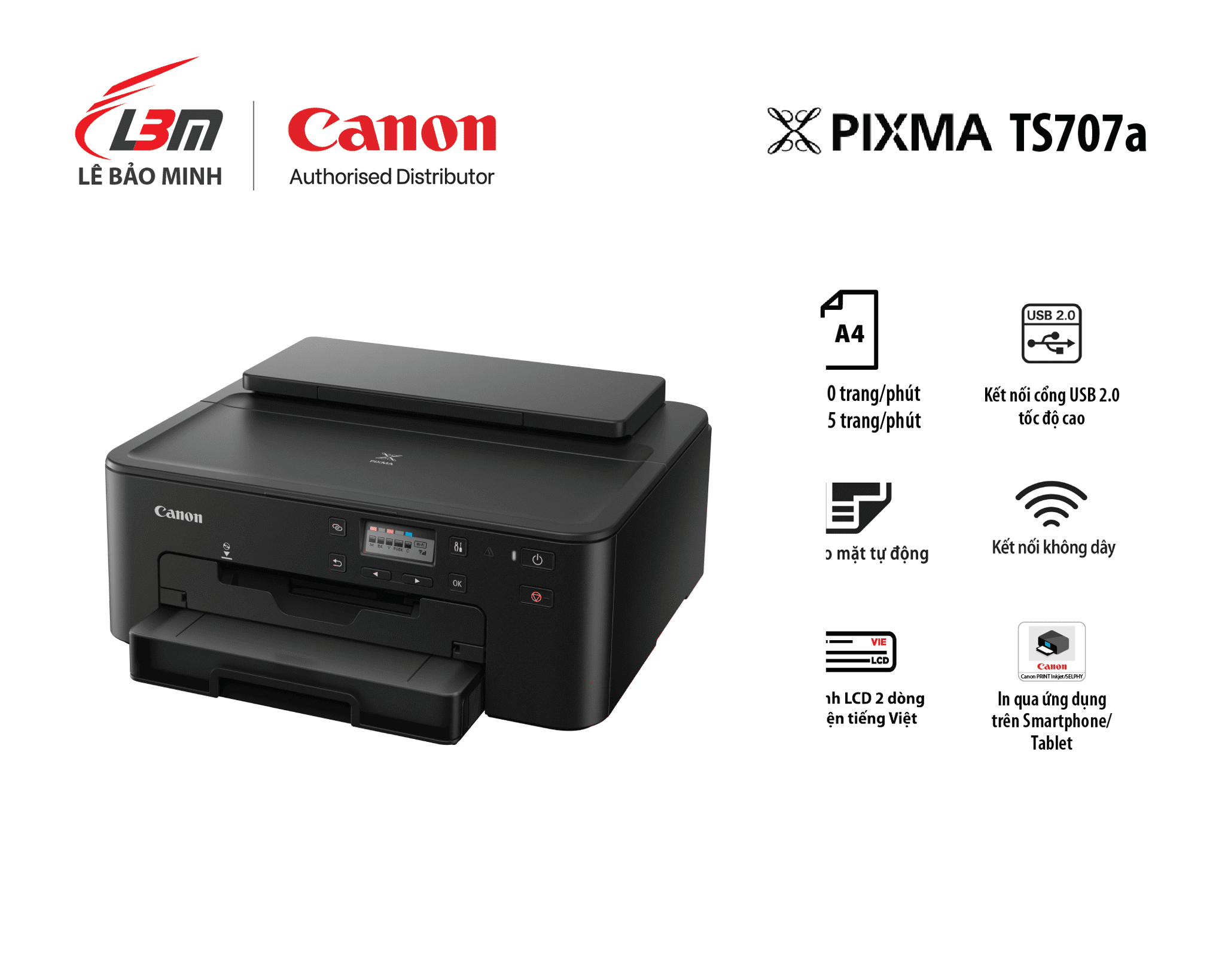 Máy in phun Canon Pixma TS707A là dòng máy in phun màu nhỏ gọn được thiết kế dành cho văn phòng nhỏ, hộ gia đình và doanh nghiệp in ấn vừa phải, nơi cần chất lượng bản in sắc nét và chi phí hợp lý. Máy hỗ trợ in hai mặt tự động (duplex), kết nối WiFi, LAN, USB, và tương thích với ứng dụng in di động Canon PRINT Inkjet/SELPHY, AirPrint, Mopria, giúp người dùng in ấn dễ dàng từ điện thoại, máy tính bảng hoặc laptop mà không cần dây kết nối.
